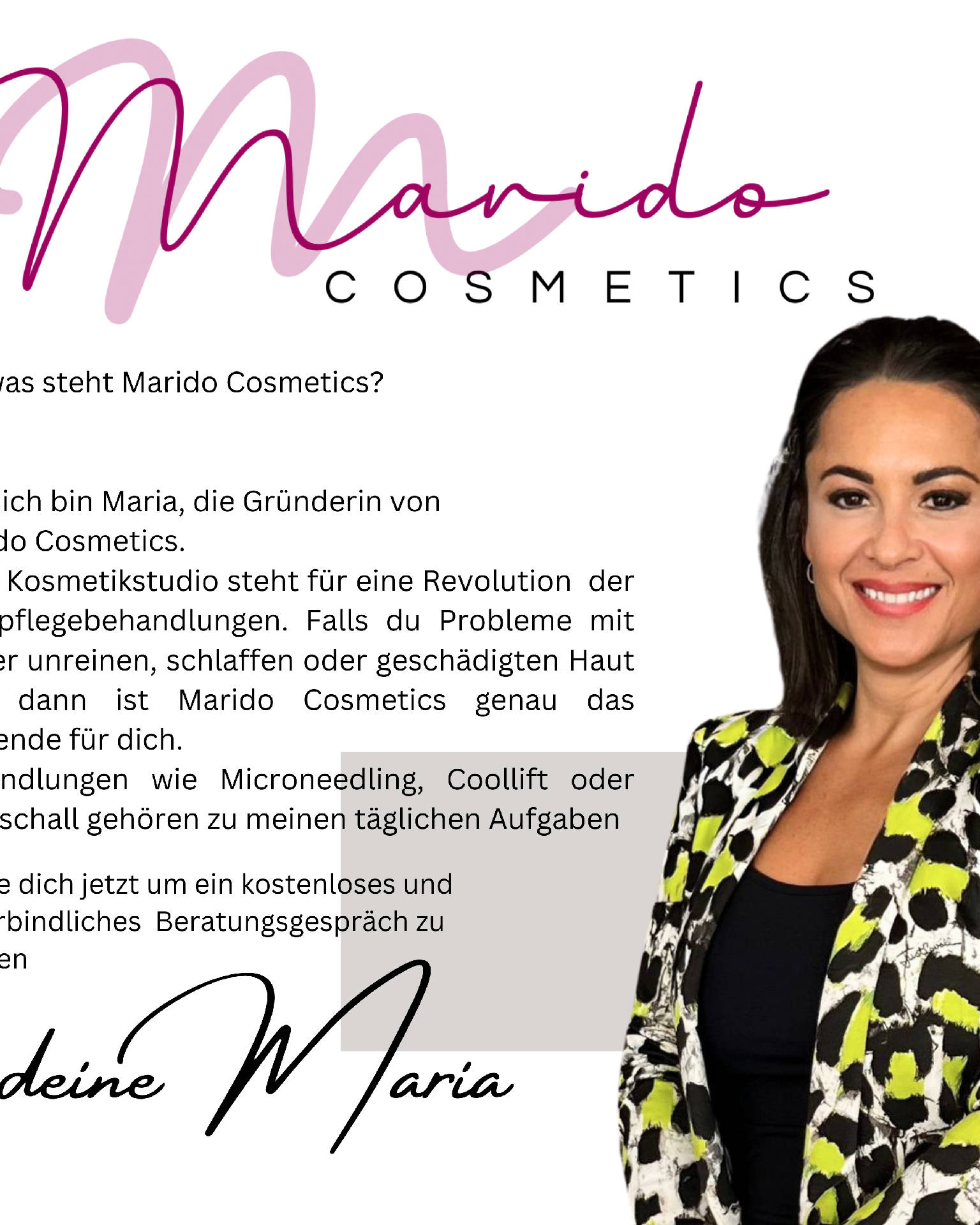 Für was steht Marido Cosmetics? Hi, ich bin Maria, die Gründerin von Marido Cosmetics. Mein Kosmetikstudio steht für eine Revolution der Hautpflegebehandlungen. Falls du Probleme mit deiner unreinen, schlaffen oder geschädigten Haut hast dann ist Marido Cosmetics genau das Passende für dich. Behandlungen wie Microneedling, Coollift oder Ultraschall gehören zu meinen täglichen Aufgaben