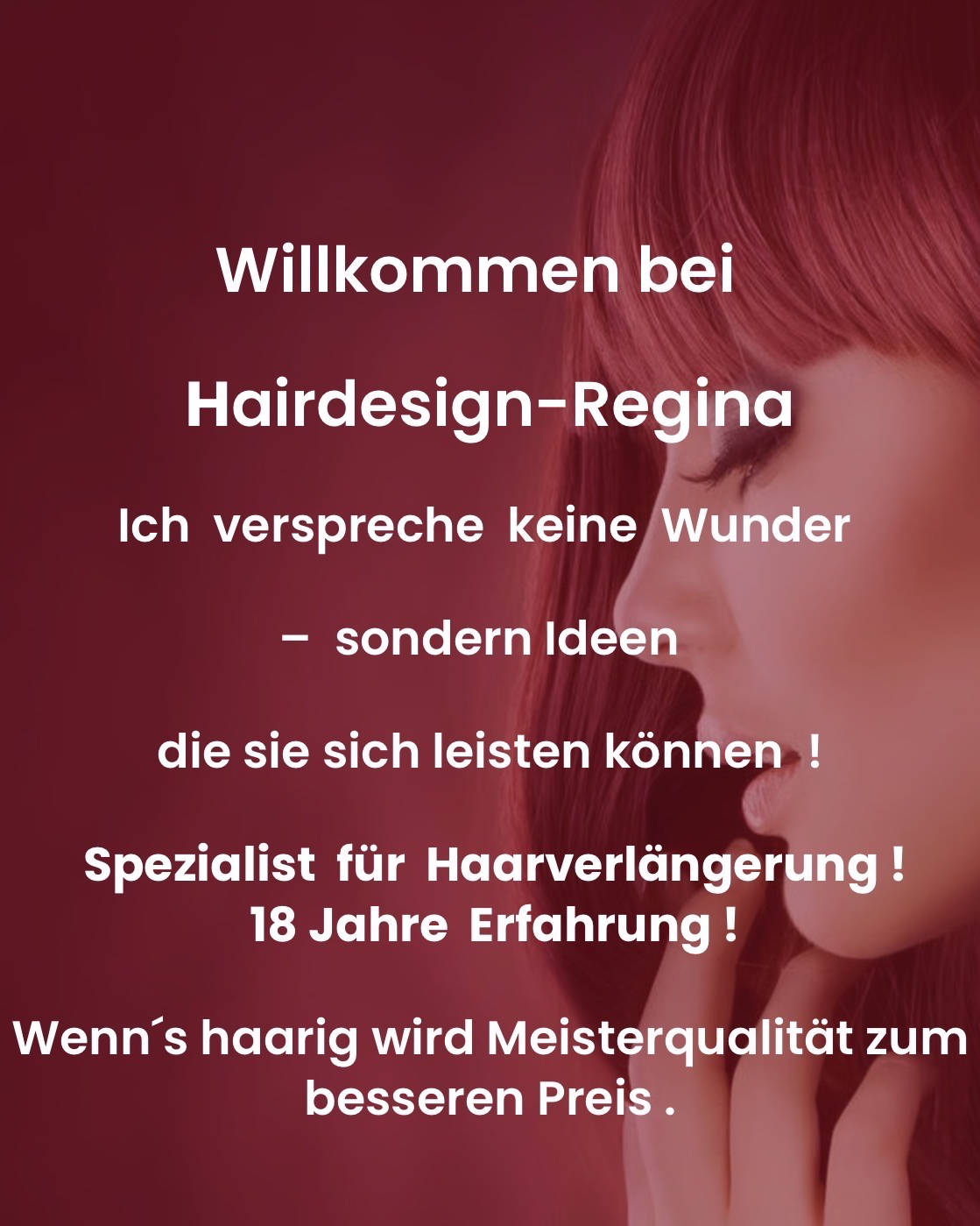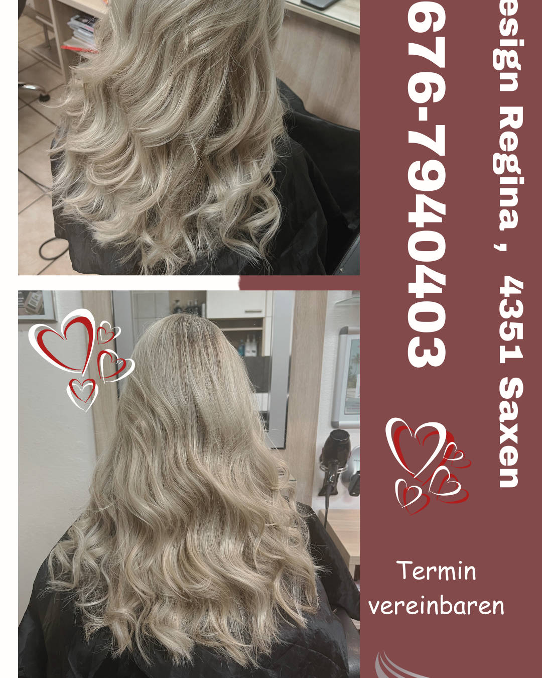 Termine bitte über Tel od. WhatsApp: 0676-7940403 Biete Ratenzahlungen & Onlinezahlung an für: - Haarverlängerung - Haarverdichtung - Haarerweiterung usw… Einfach melden… Zahlung erfolgt über einen Zahlunglink oder auch bei mir vor Ort. Meine Leisungen • Haarverlängerung • Haarverdichtung • Haarerweiterung • Haarglättung • Haarrettung • Haarveredelung • Haarsträhnen • Haarfärbung • Haarstyling • Haatschnitt Meine WEB: https://www.salon-regina.at/ Spezialist für Haarverlängerung ! 18 Jahre Erfahrung ! Wenn´s haarig wird Meisterqualität zum besseren Preis .