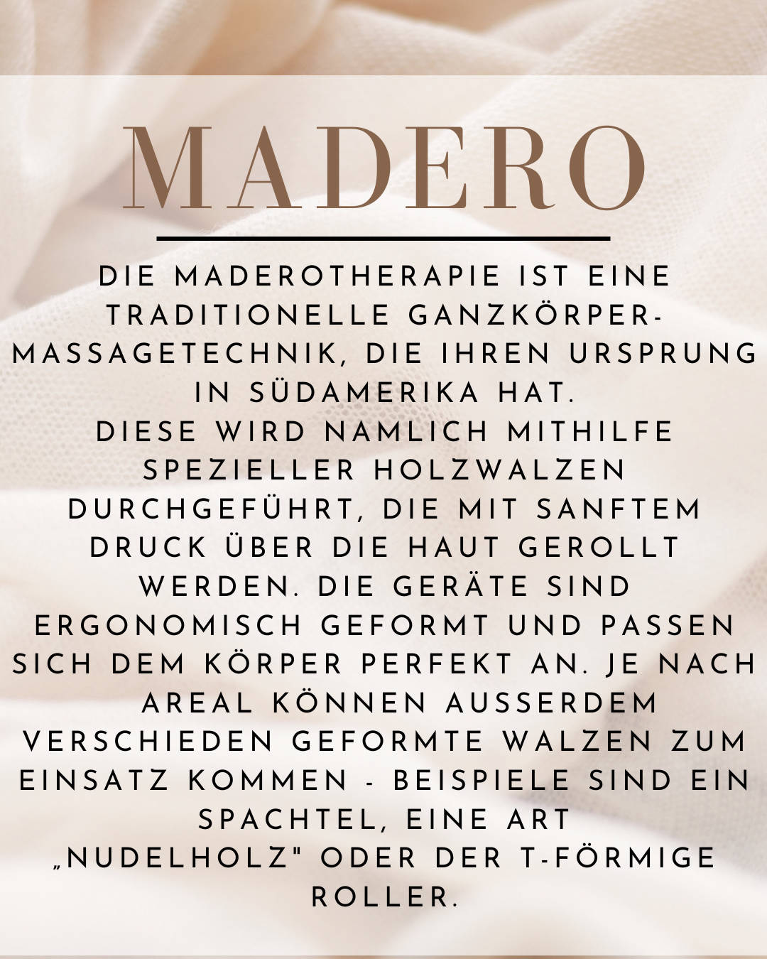 MADERO DIE MADEROTHERAPIE IST EINE TRADITIONELLE GANZKÖRPER-MASSAGETECHNIK, DIE IHREN URSPRUNG IN SÜDAMERIKA HAT. DIESE WIRD NAMLICH MITHILFE SPEZIELLER HOLZWALZEN DURCHGEFÜHRT, DIE MIT SANFTEM DRUCK ÜBER DIE HAUT GEROLLT WERDEN. DIE GERÄTE SIND ERGONOMISCH GEFORMT UND PASSEN SICH DEM KÖRPER PERFEKT AN. JE NACH AREAL KÖNNEN AUSSERDEM VERSCHIEDEN GEFORMTE WALZEN ZUM EINSATZ KOMMEN - BEISPIELE SIND EIN SPACHTEL, EINE ART „NUDELHOLZ" ODER DER T-FÖRMIGE ROLLER. VORTEILE DIE MADEROTHERAPIE IST KEINE KLASSISCHE ENTSPANNUNGSTECHNIK. VIELMEHR HANDELT ES SICH UM EINE TIEFENWIRKSAME BEHANDLUNG, DIE DAS GESAMTE WOHLBEFINDEN STEIGERN, DIE KONTUREN STRAFFEN UND ÜBERSCHÜSSIGES FETT VERABSCHIEDEN SOLL. @HAUTNAH